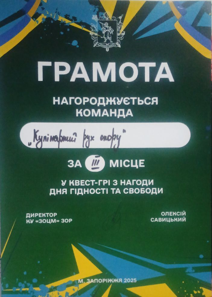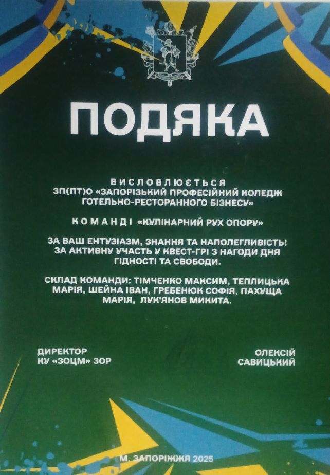 Студентська команда нашого коледжу “Кулінарний рух опору” у складі: Тімченка Максима-група КК-153, Гребенюк Софії-група КОБ-184, Теплицької Марії-група КК-153, Шейни Івана-група КОБ-183, Пахущої Марії-група